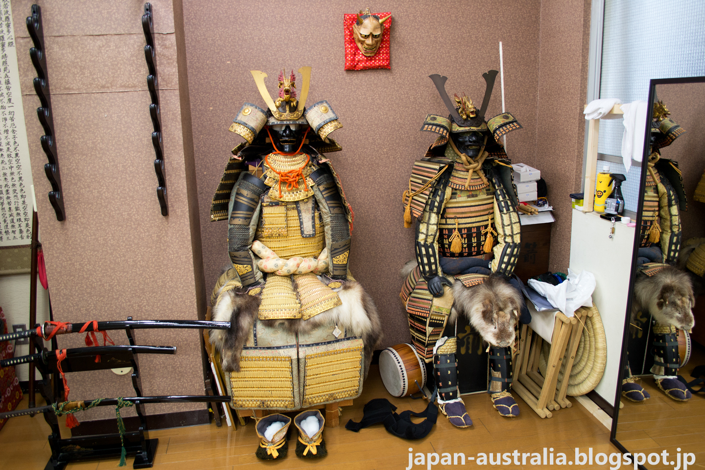 We arrived at the dojo (training hall) located near Kudanshita Station on the purple Hanzomon Metro line in the early afternoon. The dojo is located on the second floor of an old building and is full of authentic samurai armour, swords, tsuba (samurai sword guards) and pictures. The oldest piece of samurai armour dates from the 17th century and once belonged to a famous samurai in the Kanto region of Japan.