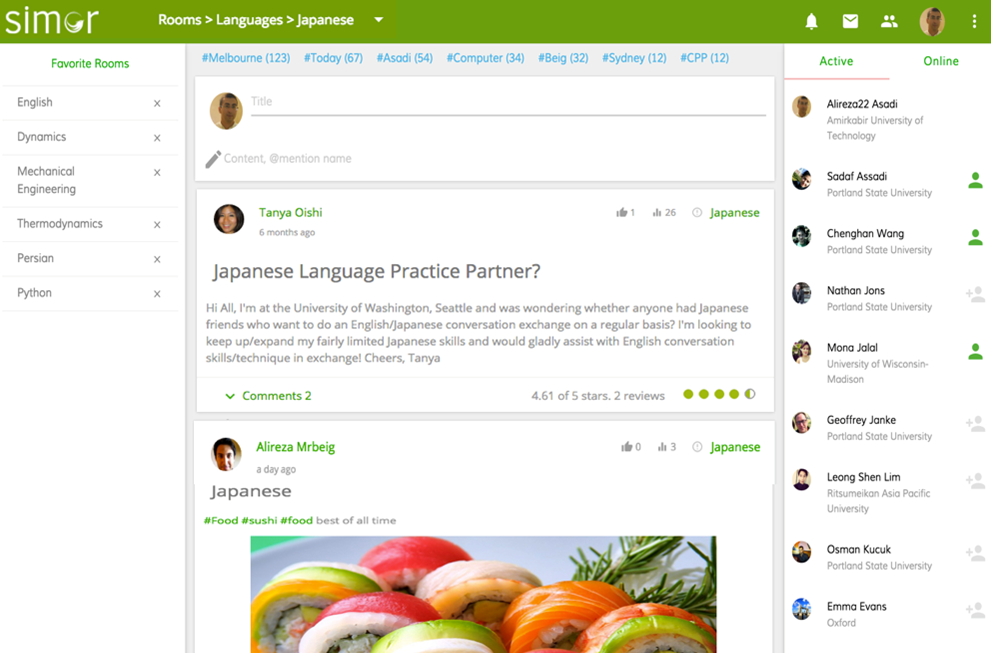 Simor is a great tool for you to connect with native and non native Japanese speakers. It allows you to connect with like-minded people from all over the world. In Simor rooms, you can find a Japanese room where people instantly share their interests, questions, answers and thoughts on Japanese culture, language, food, cities, and more.